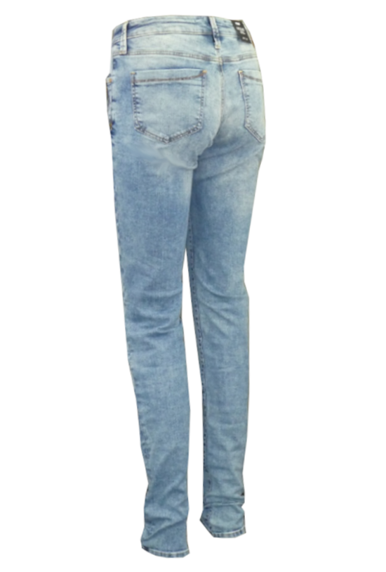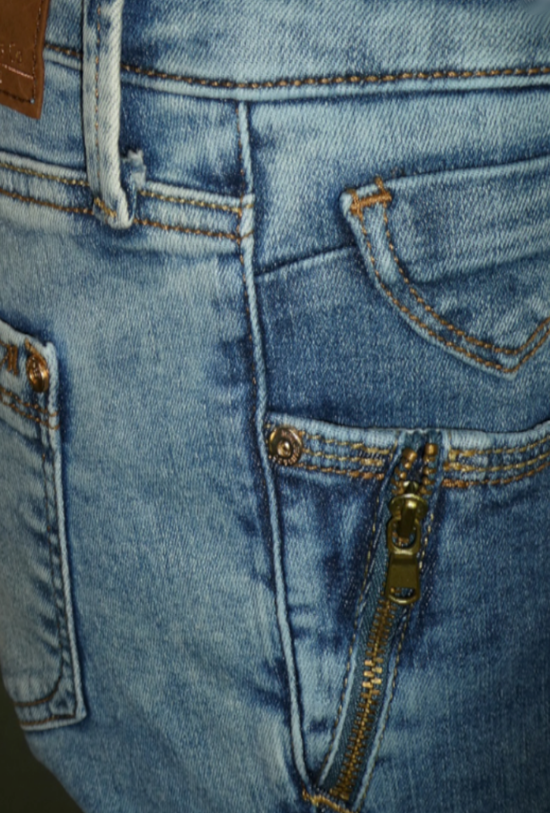 Description: Low fashion jeans with lots of details, such as decorative zippers, 5 pockets, loops fitting broad belt, short zipper, straight seam on the back pockets and slim legs. Mid stretch in fabric. Bleached fabric.