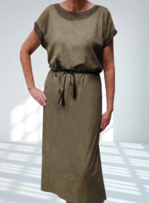 Description: Stylish, comfortable dress in a longer model made in an eco-friendly way and fabric. Belt in waist. Lovely mat colour. True in size.