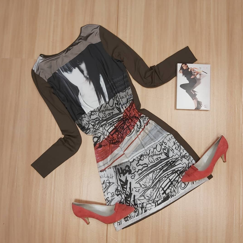 Description Make a statement with this dress with a beautiful photoprint at the front. The rest of the dress is made of a thick quality viscose jersey.