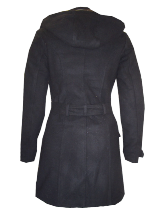 Description Wool coat with many details: zipper plus buttons, detachable hood, waist belt, patch pockets with button closure, cuffs and epaulettes, shoulder yoke at the back and trench coat flap in the front, front and rear darts for a slim fit