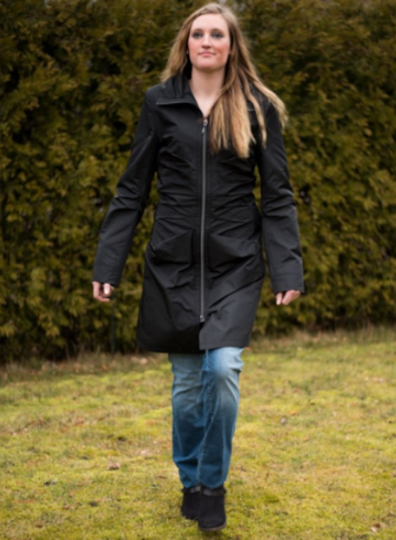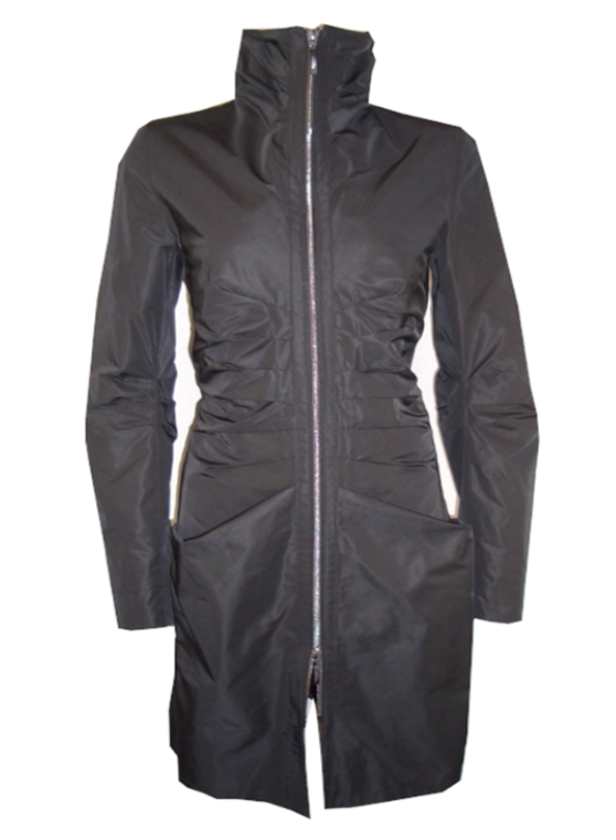 Description The black spring coat with elegant folds on the torso is easily combinable. The wide collar can be worn either raised or folded depending on the weather. The 2-sided zipper runs along the middle of the entire coat. The two slit pockets make accessing the content of the pockets easy, the inside pocket is closable. On the backside there are adjustable ties, with which one can emphasize the waist nicely.