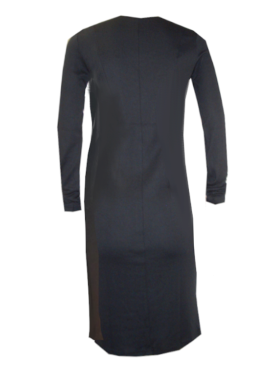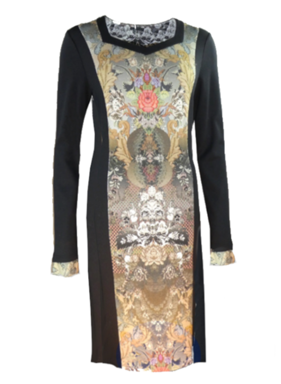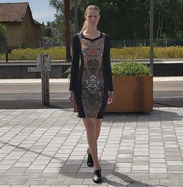Beskrivning Figursydd klänning med tryck fram samt nederst på ärmarna. Färgen på trycket beror på vilken storlek man tar, en del har mindre orange på sig. Vill man inte ha den så tajt så väljer man en storlek större.