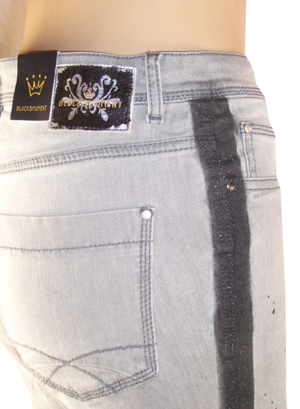 Description: Very luxurious bleached light blue/gray jeans with a perfect fit. Lovely stretch in the fabric and stripes that glow a bit and small dots spread on the upper front legs. Five pockets. Key ring. This is the latest fashion, a little wrinkle on the legs, which are slim. Big in size.