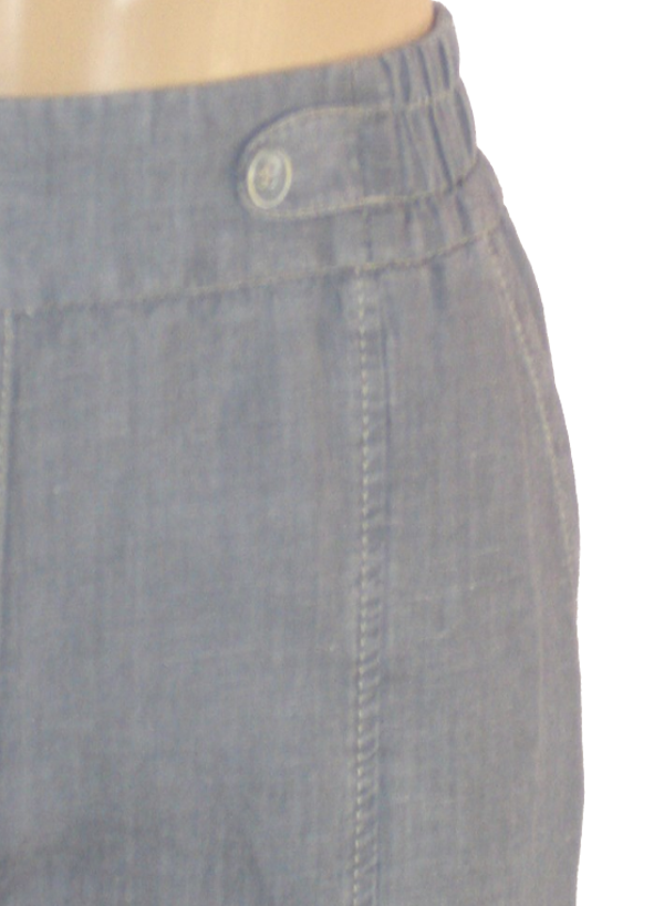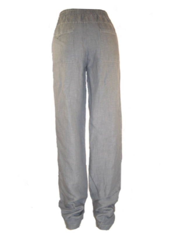 Description: Very comfortable trousers with a high waist and airy fabric. Lovely leg width, slightly tapered down bottom, elastic waist and buttons as decoration. Four spacious pockets.