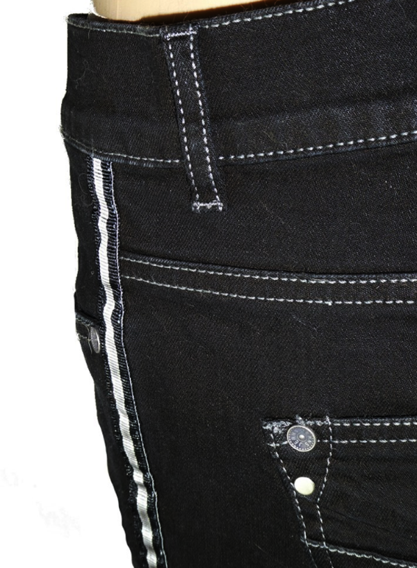 Description: A bit stretchy five-pocket jeans. Silvery stripes along legs. Slim leg.