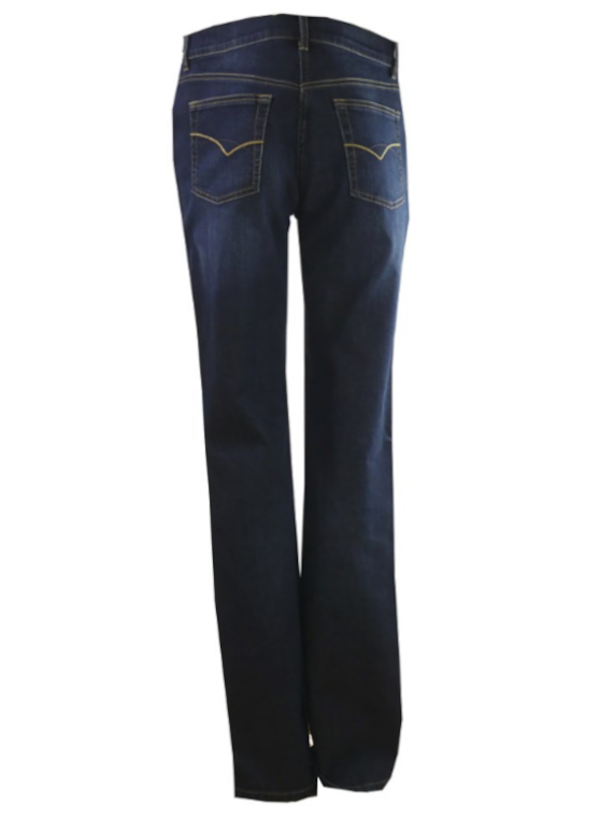 Description: Jeans with a bit higher waist and dark, dark blue in color. Dark yellow and white seams. Decoration on the back pockets. The legs are slightly tapered. Perfect fit for most women but also men.