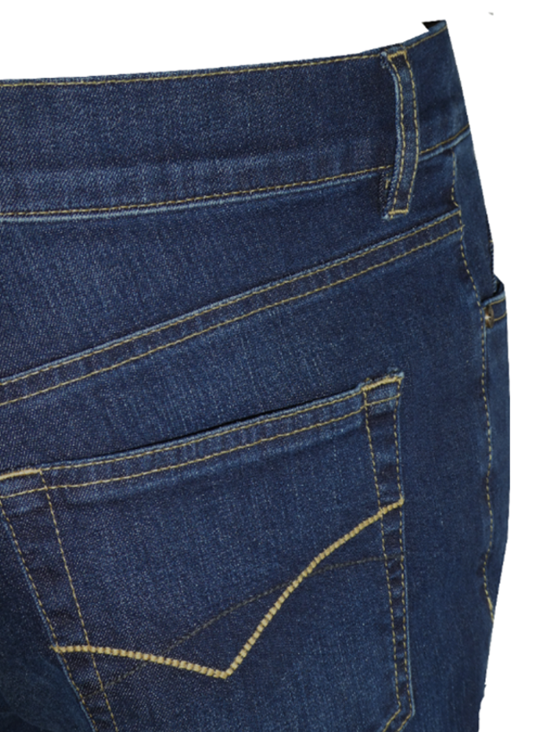Beskrivning:Stretchiga jeans med lite högre midja och jeans-blå i färgen. Gulbruna och benvita stickningar i sömmarna. Lite mönster på bakfickorna. Benen är raka med god plats för knäna och därför våra mest populära raka jeans. Mycket bra passform för de flesta.