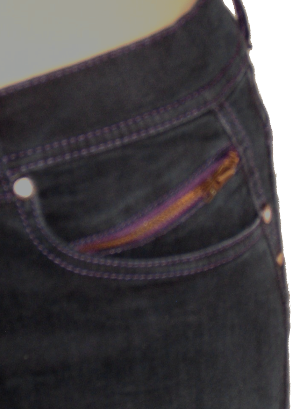 Description: Luxurious, slim, deep blue/purple jeans with a little stretch in fabric. Two pockets on front and two back. Stylish pockets with zipper in detail.