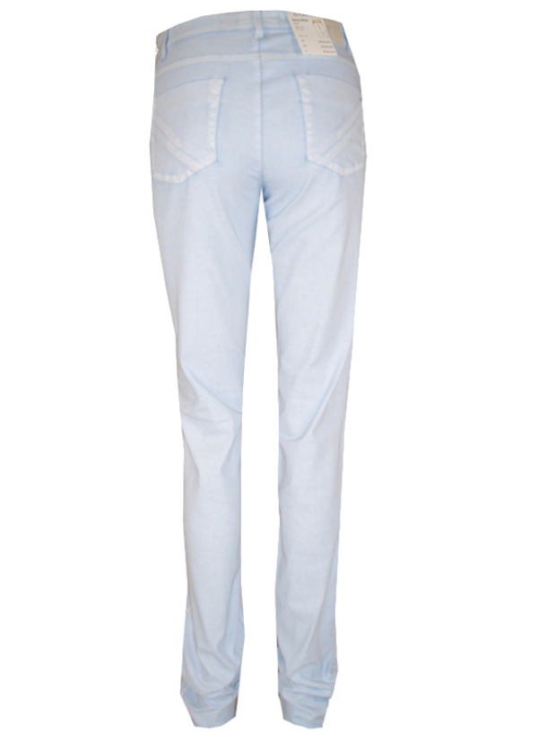 Description: Exclusive and trendy comfortable pants with four pockets, two zipped. The broken color shows up a "used look". Hem that runs along the front pockets. Patterns on the knees and back pockets. Seven belt loops. Skinny legs. Colour light pastel blue.