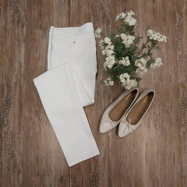 Beskrivning: Rent vita 5-fickors sommarjeans i bas-modell med slimmade ben. Endast fyra små silvriga nitar på fickorna fram och silvrig knapp. Enkla hällor. Lätt stretch i tyget.