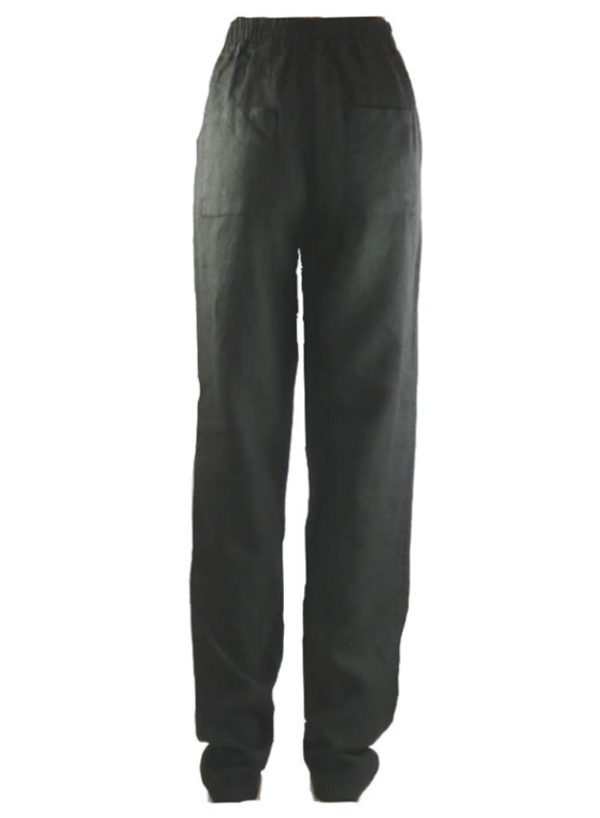 Description: Black linen trousers, on the waist, with elastic and slightly tapered legs. Two slanting pockets on front and two stright on back. Fake fly pants. The black color is perfect all year round.