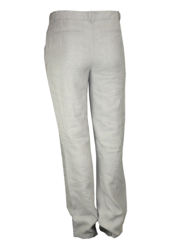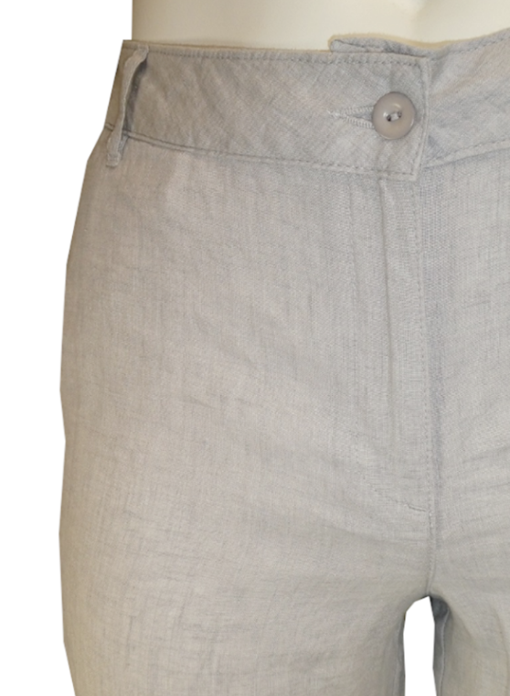 Beskrivning: Välsittande ljust grå linnebyxor i hög kvalitet, hög midja och vida ben. Två snedfickor fram och två fejkade bak. Dragkedja med knapp och 5 hällor i midjan. Stora i storleken så vi rekommenderar minst en storlek mindre än vanligt. Mät gärna din midja och jämför.