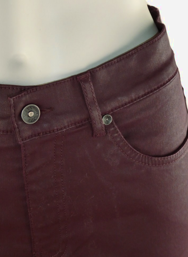 Description: High waisted super slimmed pants in a leather-like material. Tight fitting. Five pockets and belt loops on the waist. Only a little stretch. We recommend a size larger than usual because they are small in size.