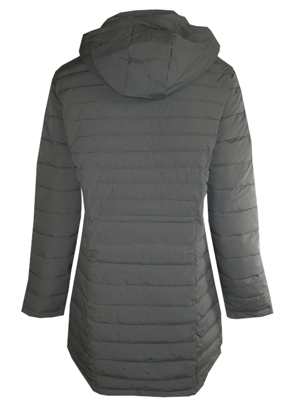 Beskrivning: Lång snygg vinterkappa, två framfickor med dragkedja och en innerficka. Dubbel puller i dragkedjan fram. Lätt figursydd modell. Avtagbar huva med snören och hög krage samt mudd vid ärmslut. Fodrad och vindtålig. Det står svart på kappans lapp men den går lite i grått, fin neutral färg.