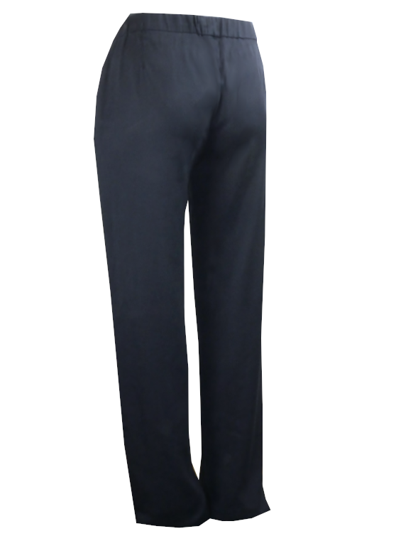 Description: Navy blue body friendly trousers with high waist, elastic and wide legs. Two slanting pockets on front. Fake fly on pants. The dark blue color is perfect in the summer and also in winter. Big in size.