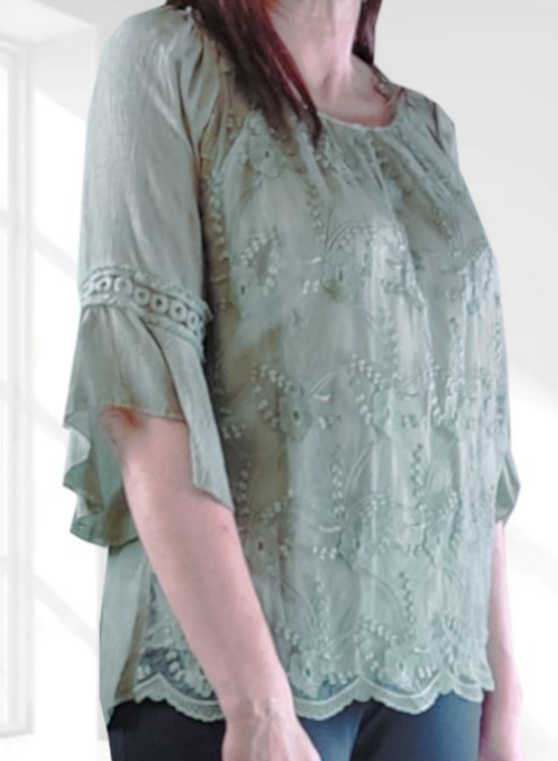 Beskrivning: En härlig Italiensk sommarblus i vävt tyg och tunn brodyr fram samt på ärmar och halslinning.