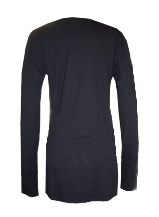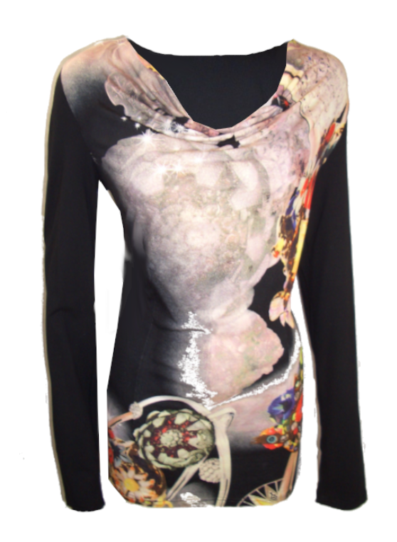 Description Viscose tunic collar with waterfall and great color pattern in the front. Back and sleeves are black. The princess seams on front and back ensure a great fit. The material is a high quality viscose and very comfortable to wear.