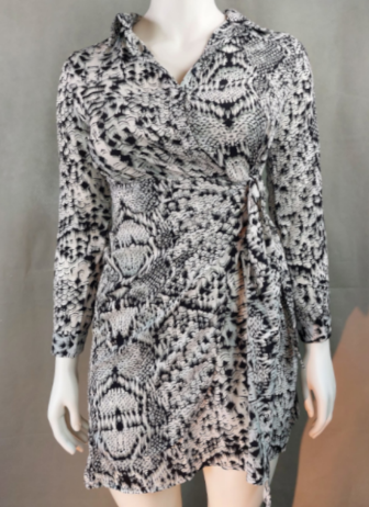 Description: Stylish, comfortable dress in a wrapped model. A bit small in size. Color black and white. Buttons on upper front and a wide belt, attached. Sleeves ends up underneath elbow and with a button.