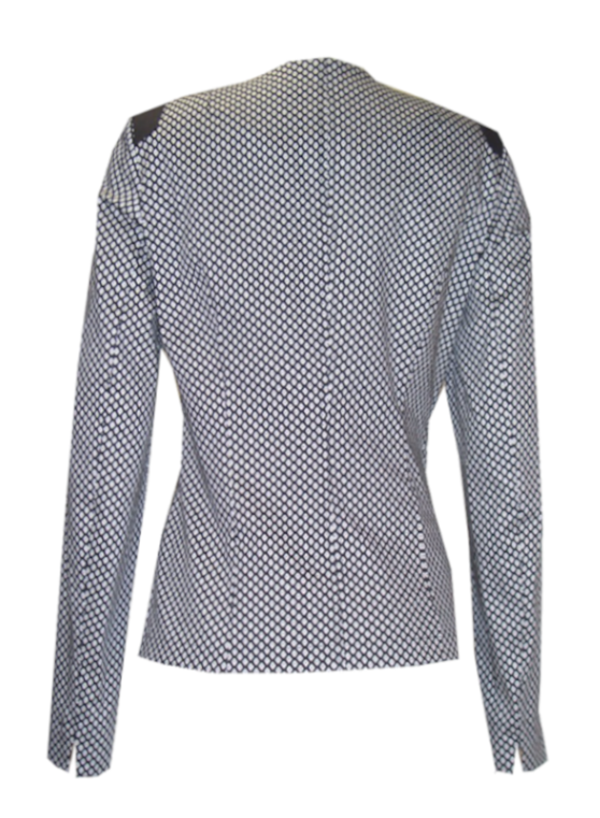 Description Unlined fitted summer blazer in the current graphic design black and white with zipper and no collar. Also great combined to a casual jeans.